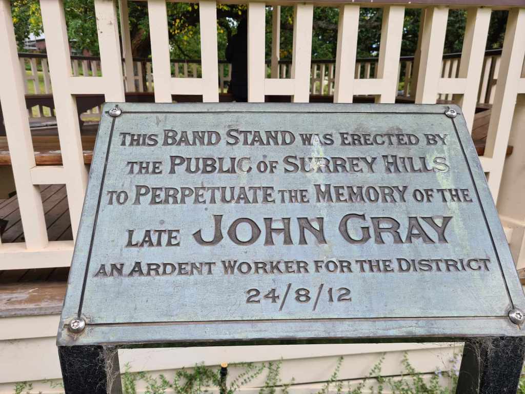 Photograph: John Gray Memorial Band Stand – Plaque, Surrey Hills.