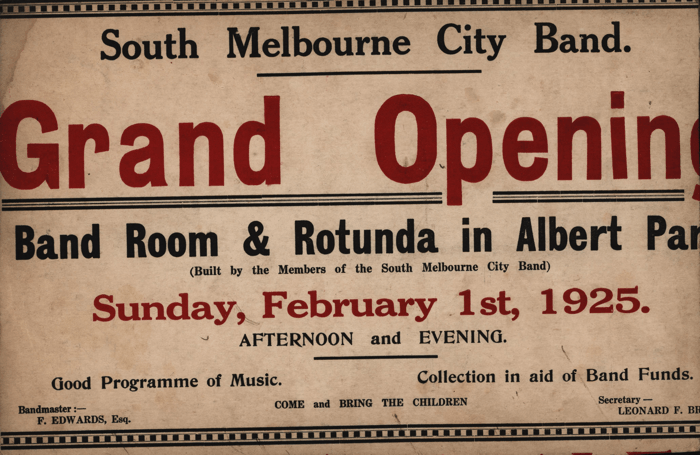 South Melbourne City Band. (1925). [South Melbourne City Band : Grand Opening : Band Room & Rotunda in Albert Park]. In Victorian Bands’ League Archive. South Melbourne, Victoria: South Melbourne City Band.
