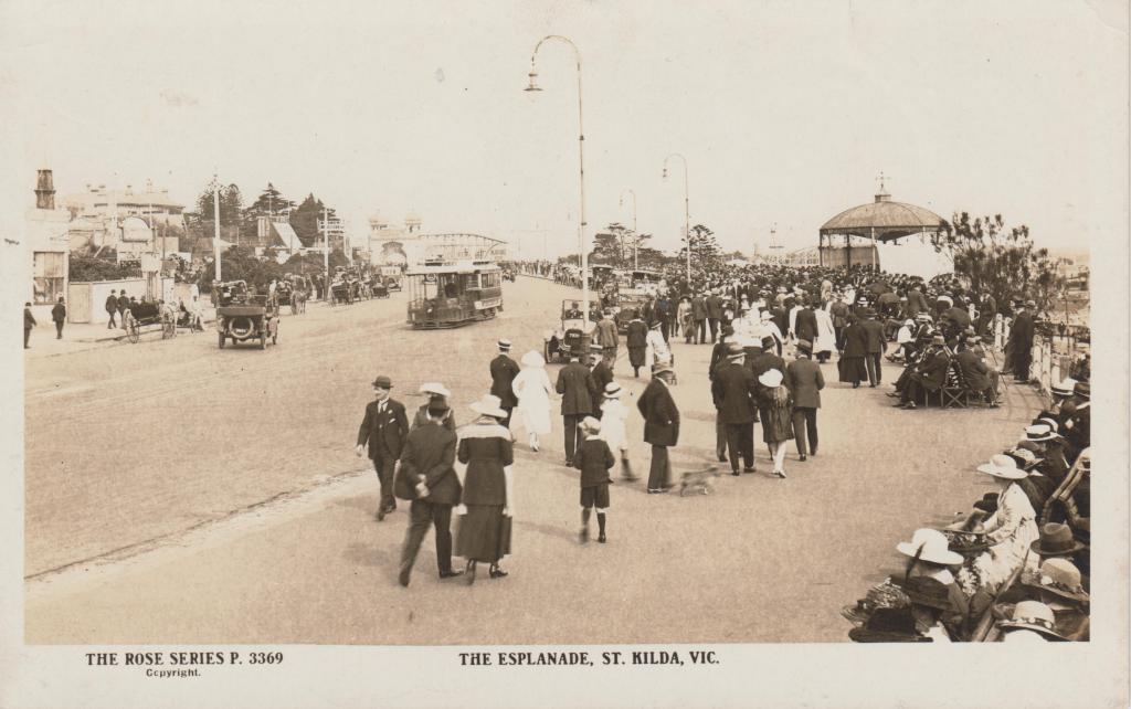 Rose, G. (n.d.). The Esplanade, St. Kilda, Vic. [Postcard]. [The Rose Series P. 3369]. The Rose Stereograph Co., Armadale, Victoria.