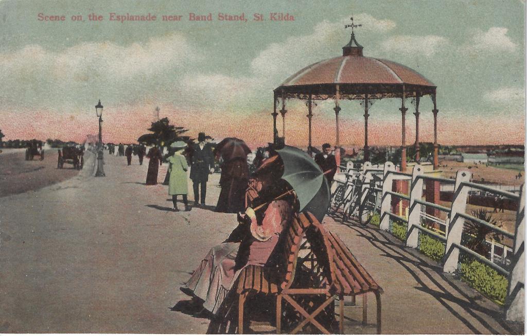 Postcard: Scene on the Esplanade near Band Stand, St. Kilda, 1909. (Source: Jeremy de Korte Collection)