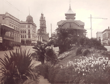 Photograph: Sturt Street Ballarat looking towards the Titanic bandstand and the Ballarat Town Hall, c1935. (Source: Victorian Collections: Ballarat Heritage Services: 03978)