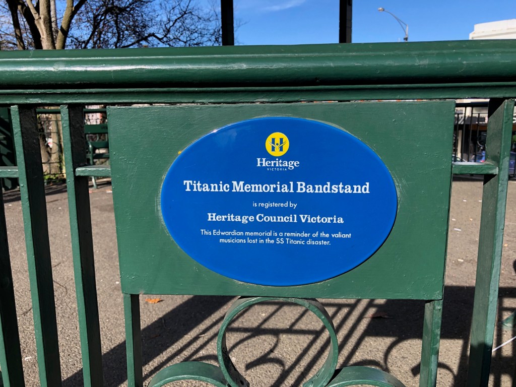 Photograph: Titanic Memorial Bandstand – Heritage Victoria Plaque. (The photograph was taken by Jeremy de Korte, 09/06/2019)