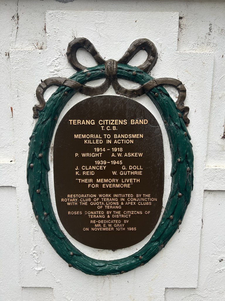 de Korte, J. D. (2024). Terang, Vic. : Terang Citizens’ Band : Memorial Band Stand – Plaque [Photograph]. [IMG_0475]. Jeremy de Korte, Newington, Victoria.
