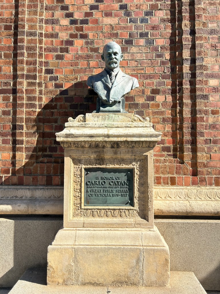 Photograph: Carlo Catani Memorial Clocktower – Site of the St. Kilda Band Stand : Bust & plaque. (The photograph was taken by Jeremy de Korte, 15/04/2025)