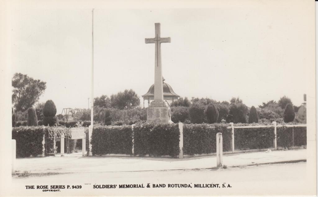 Rose, G. (n.d.). Soldiers’ Memorial & Band Rotunda, Millicent, S.A. [Postcard]. [The Rose Series. P. 9439]. Rose Stereograph Co., Armadale, Victoria.